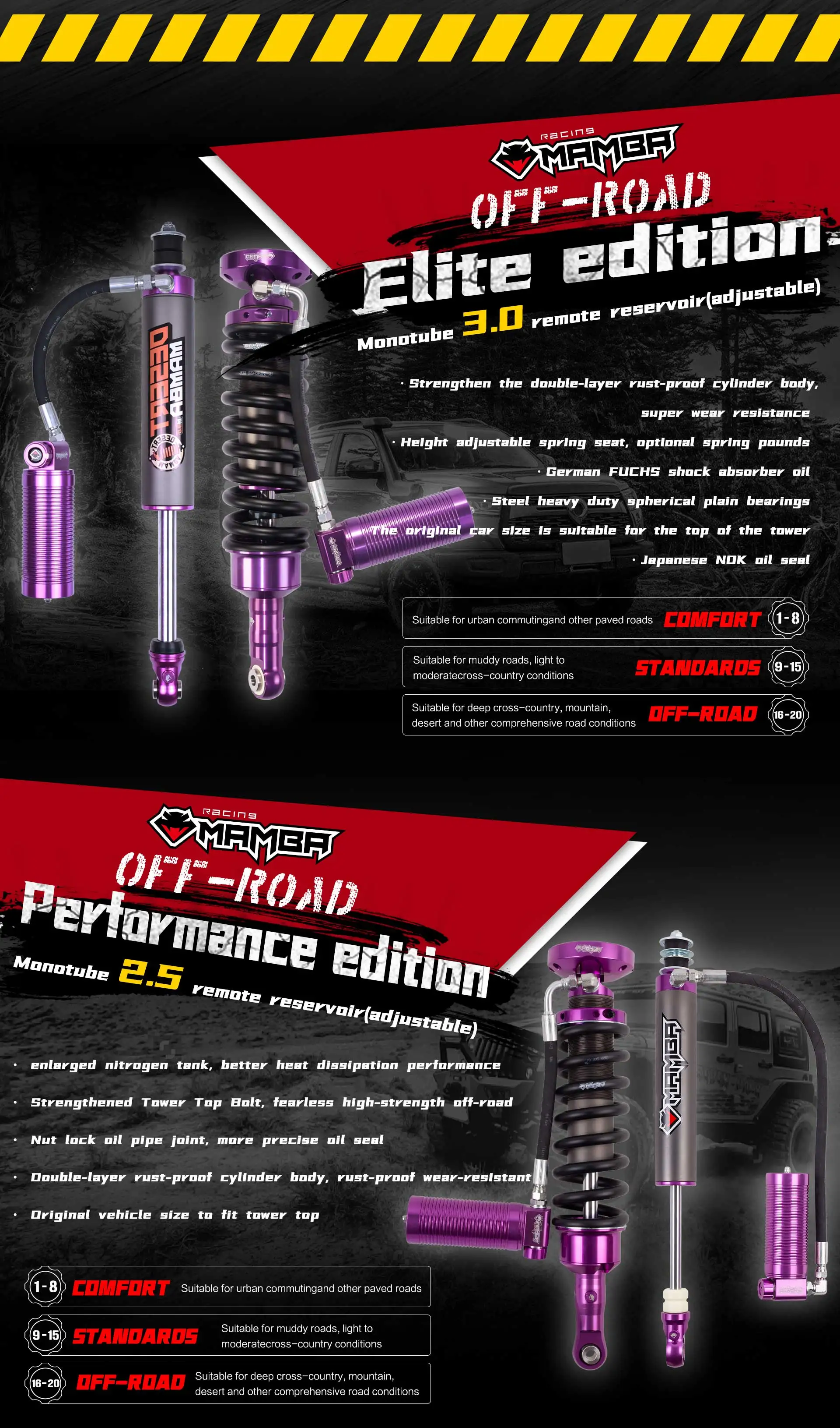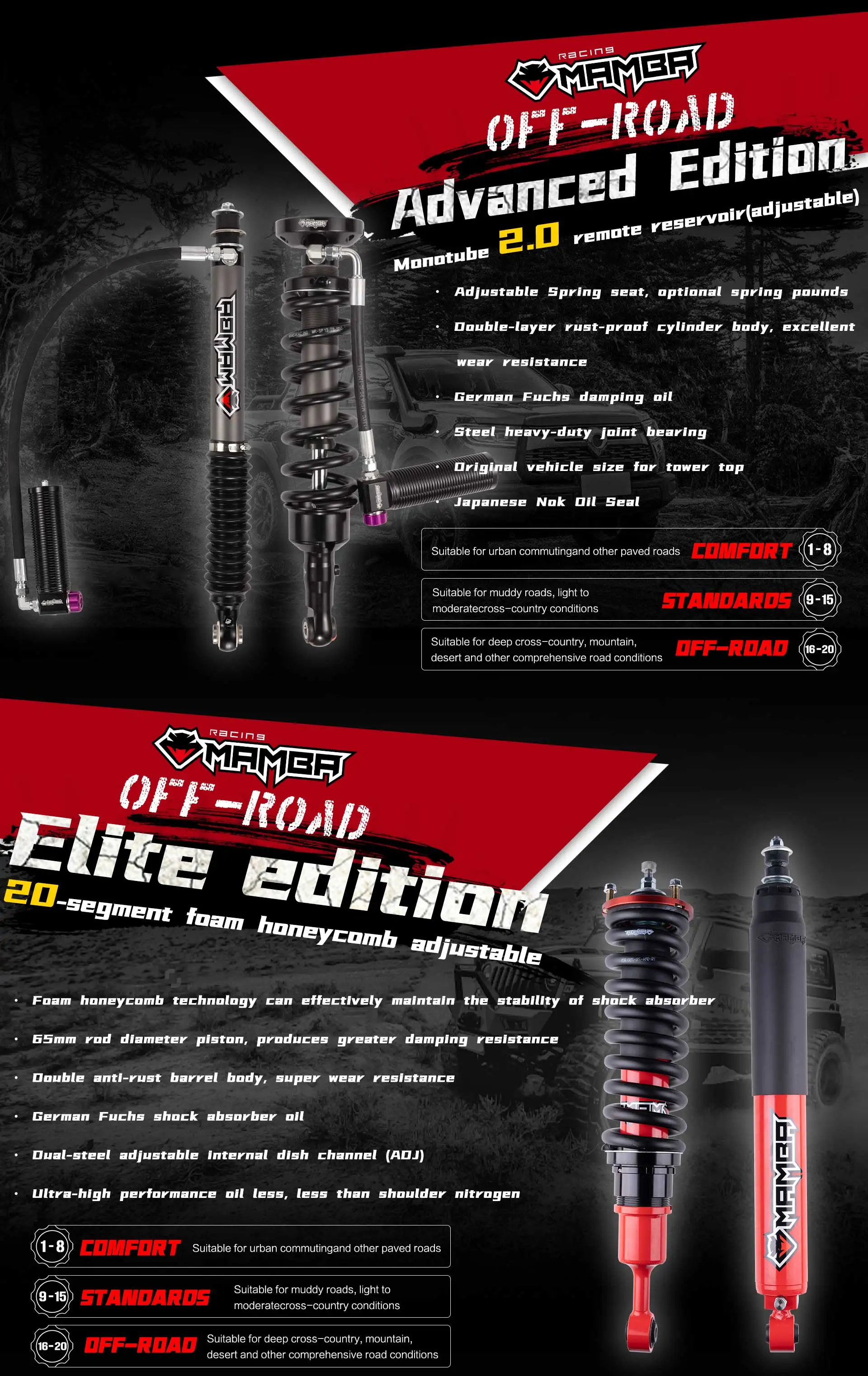 Feature | *2.5″Mono-tube design,with high-purity and high pressure Nitrogen. *Double oil seal design to ensure durability under extreme conditions *High-strength alloy steel barrel body with double electroplating treatment on the surface *The 20-stage compression and rebound damping adjustable is suitable for preciser adjustment of the vehicle |