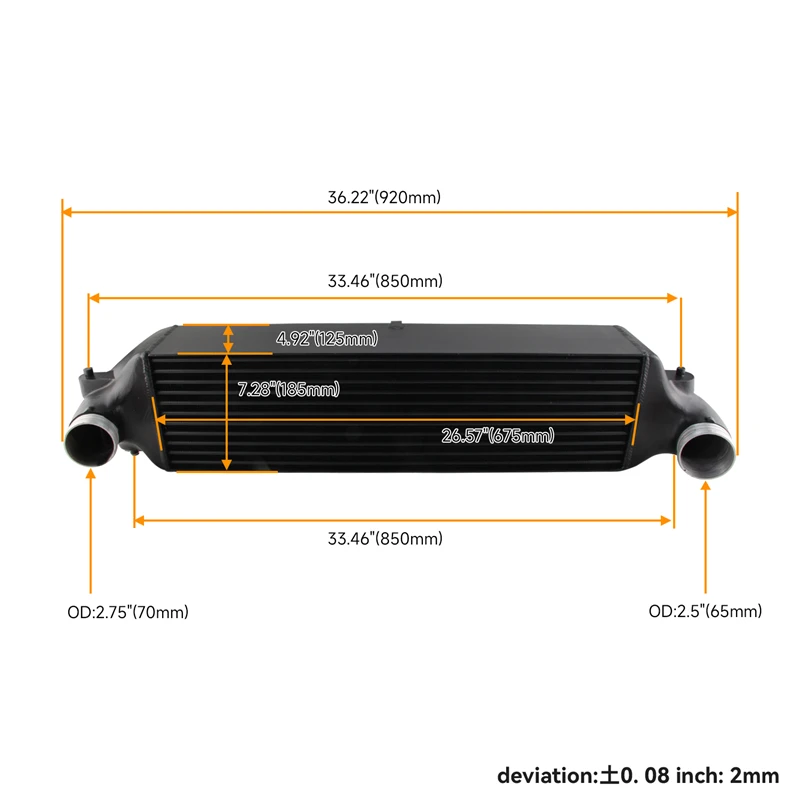 Inlet diameter: Ø65mm/2,56Inch ; Outlet diameter Ø70mm/2,75InchInclude: 1PCS IntercoolerNote:Doesn’t come with installation instructionsWe recommend professional installation Only.