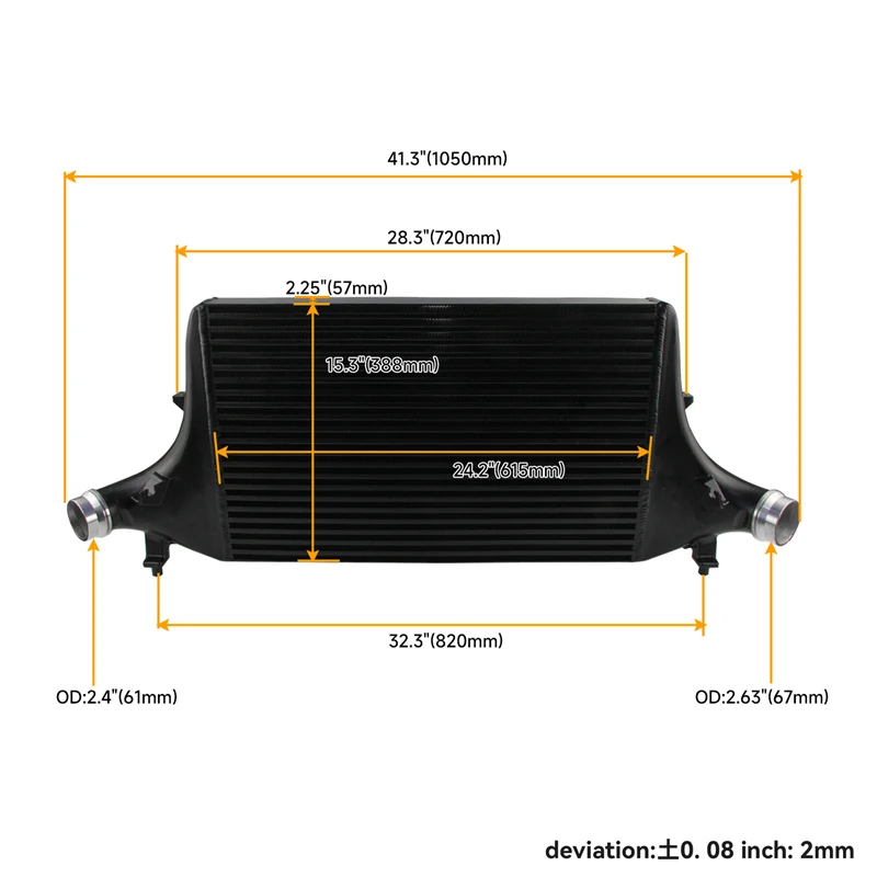 The cast aluminum end boxes were precisely designed in CAD and optimized using CFD simulations to ensure ideal internal airflow. Specially integrated air routing in the radiator inlet ensures uniform filling of the intercooler core and maximum cooling characteristics with minimal backpressure. The newly developed Competition high-performance core also ensures sufficient airflow to adjacent components such as the water cooler . This intercooler allows for optimal cooling of the supercharged air.