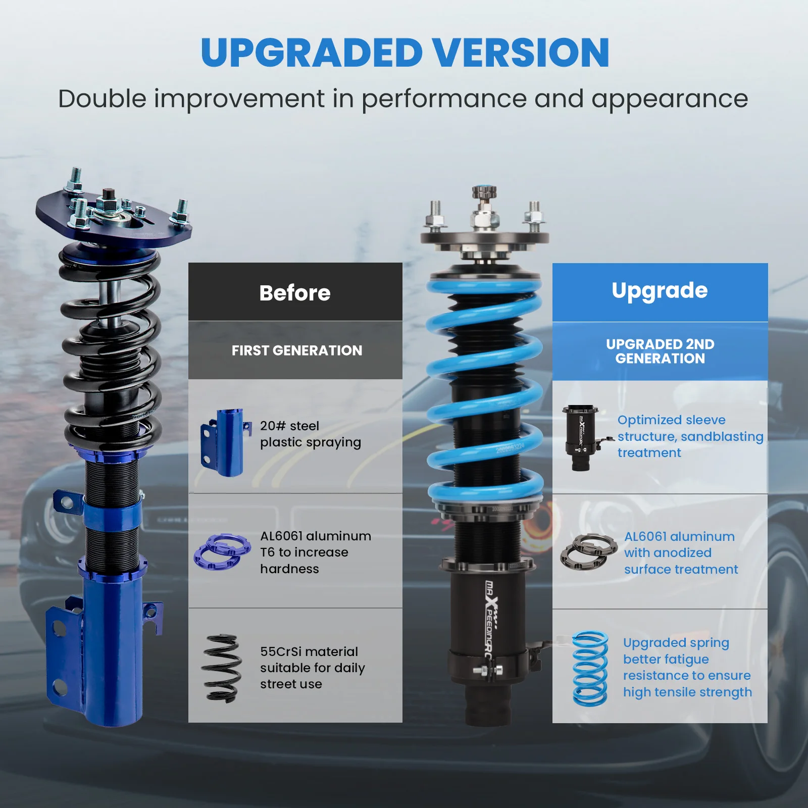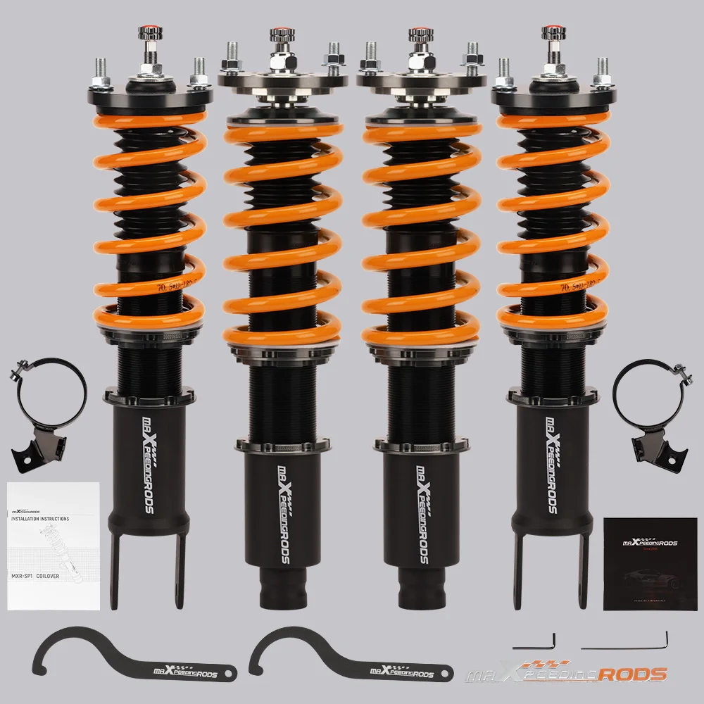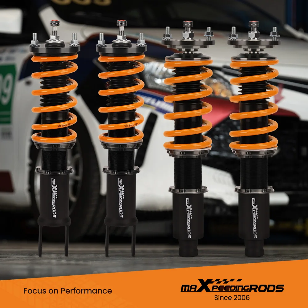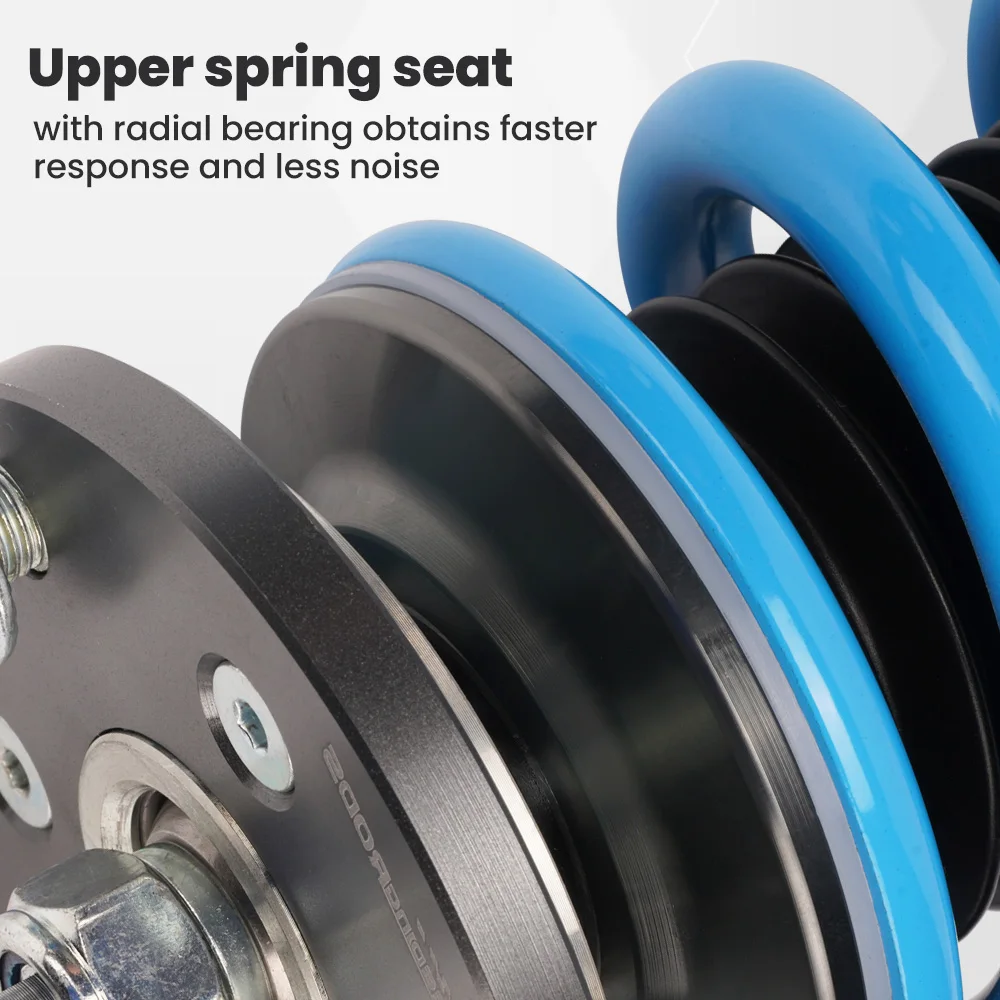 Features | 1. Lowered height adjustment from 1″ – 3″ which allow lower center of gravity and also add a more aggressive stance. 2. 3. 4. 5. 6. Upgraded valving for more smooth ride. 7. Twin-Tube structure allows sufficient stroke within the shock absorber. 8. High-Performance Damping Oil–maintains a stable viscosity in a broad temperature range, which sustains smooth stroke and reliable damping force in a variety of circumstances. 9. High Tensile Performance Spring – 10. Decent appearance benefits from 11. Most pieces in our coilover systems, including mounts, collars and spring perches, are made from resulting in light weight, durable and rust resistant components. 12. All coilovers were produced and assembled at | |