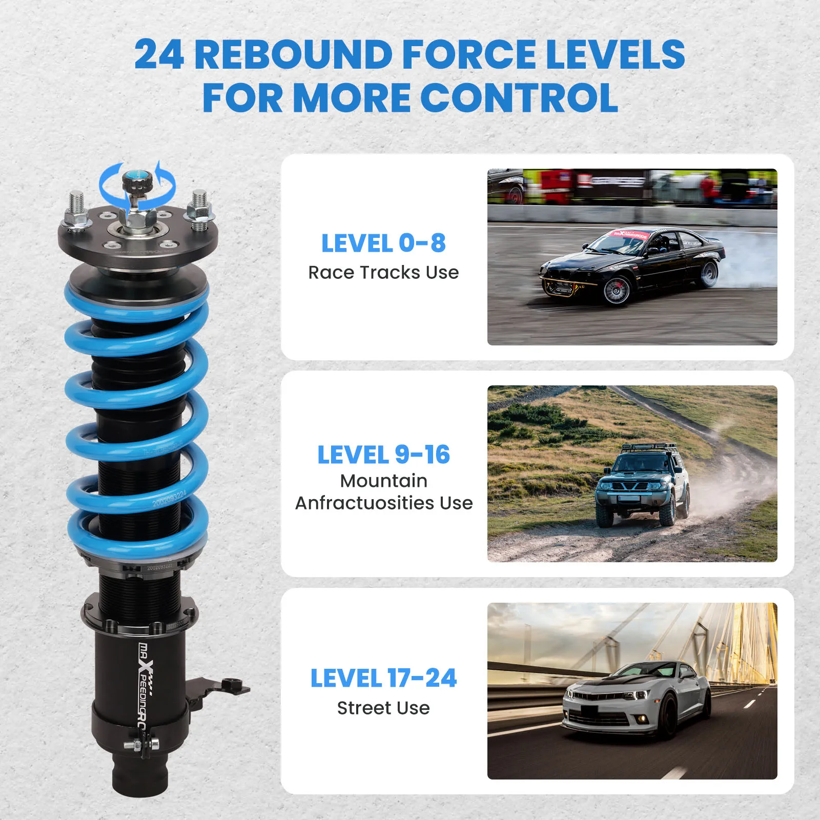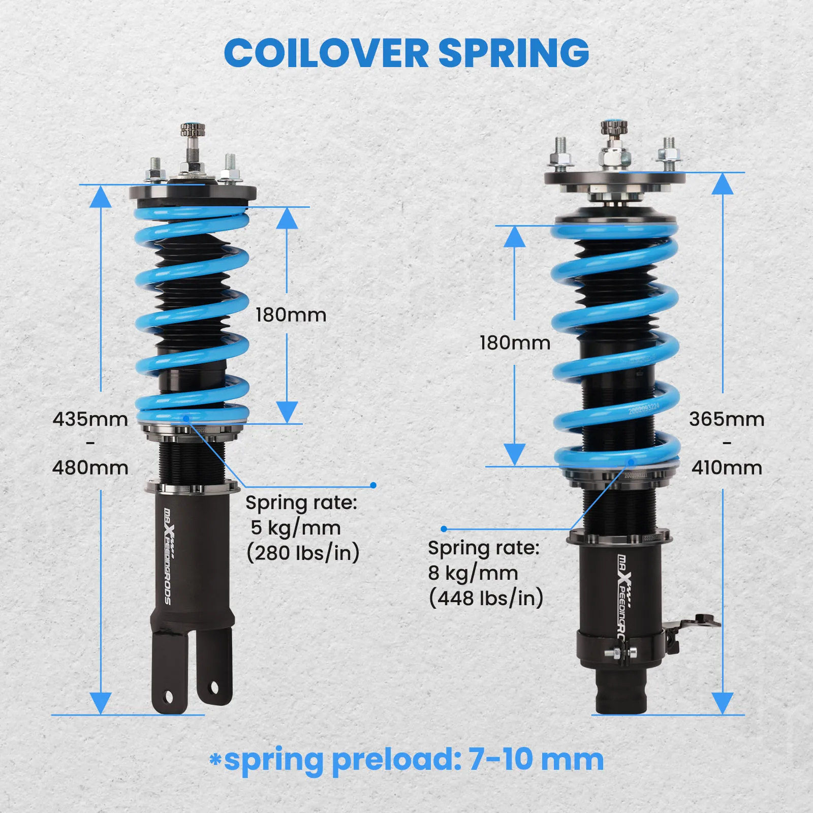 Coilover overall length | Front: 365mm-410mm Rear: 435mm-480m | |