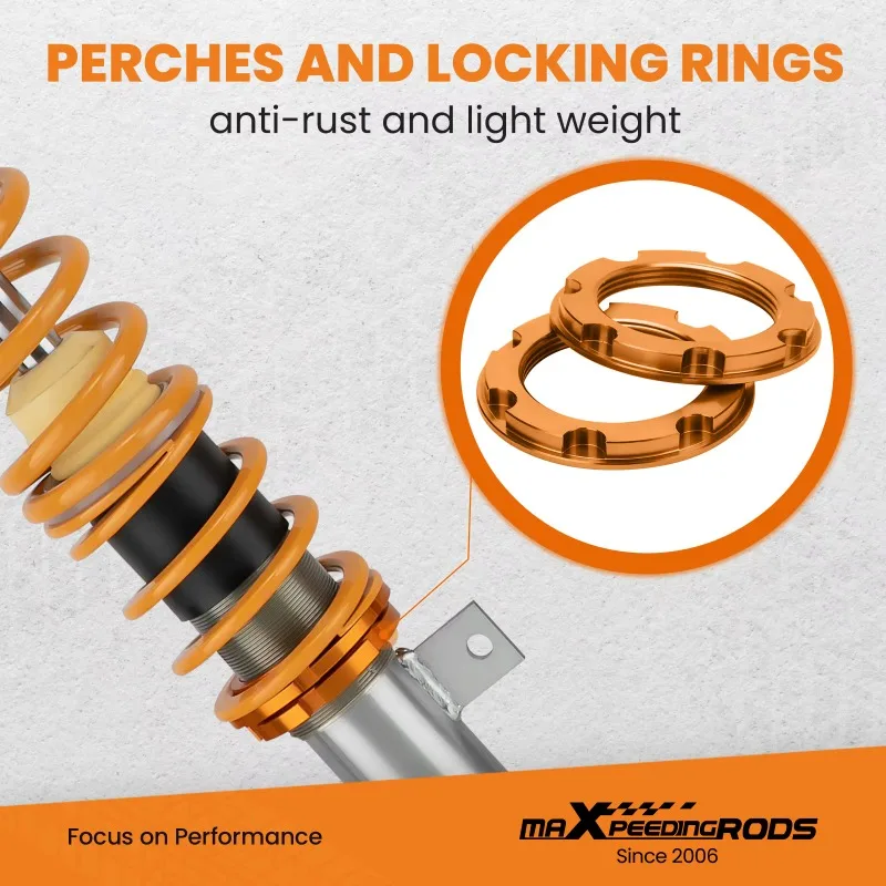 Features: 1. 35mm-75mm lower height adjustable 2. Dust boot, solid rubber bump stops 3. Weight Saving Aluminum Components And heavy duty Steel Lower Mount Brackets 4. Simple install, Easy to adjust. 5. Use the vehicle’s original upper mounts (not included in our product kit). | * Adjustable ride height * 24 levels of adjustable damper — This allows you the ability to perfectly dial in your coilovers system. For a nice comfortable driving, set damping to full soft. For more spirited driving, set it to 16 clicks. For occasional track days, set it to full stiff. * Pillow ball top mount — this design helps combat noise while tuning. It also improves the steering feel and response. * Most components are made from 6061 aluminum with T6 for increased hardness — the advantages include excellent strength, and aluminum helps keep the weight down. * Hi Tensile performance spring – Under 600,000 times continuously test, the spring distortion is less than 0.04%. Plus, the special surface treatment is to improve the durability and performance. * All inserts come with fitted rubber boots to protect the damper and keep clean. * Improve your handling performance without sacrifice comfortable ride. * A fast and affordable way to easily upgrade your car’s appearance. * Easy installation with right tools. * Ideal for any track, drift and fast road and can also be used for daily driving. | |