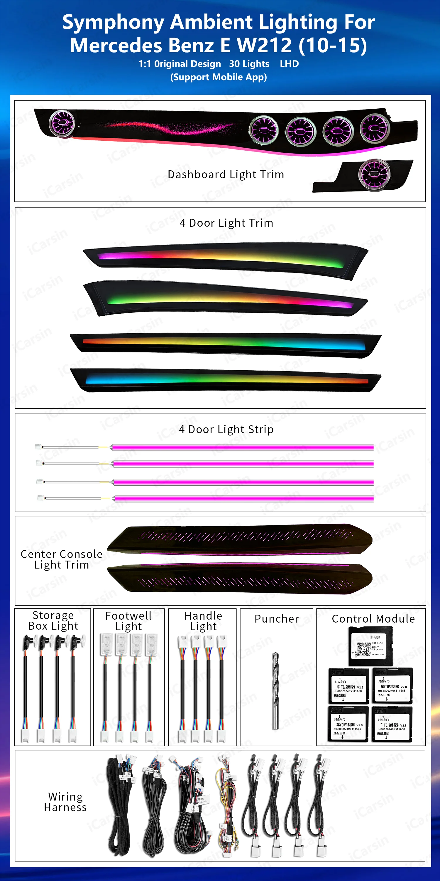 Our ambient light kit is the perfect way to add a touch of luxury to your Mercedes-Benz E-Class W212.With its bright illumination and 64 color adjustable options, you can easily transform the interior of your car and create a new ambiance and feeling for you and your passengers.