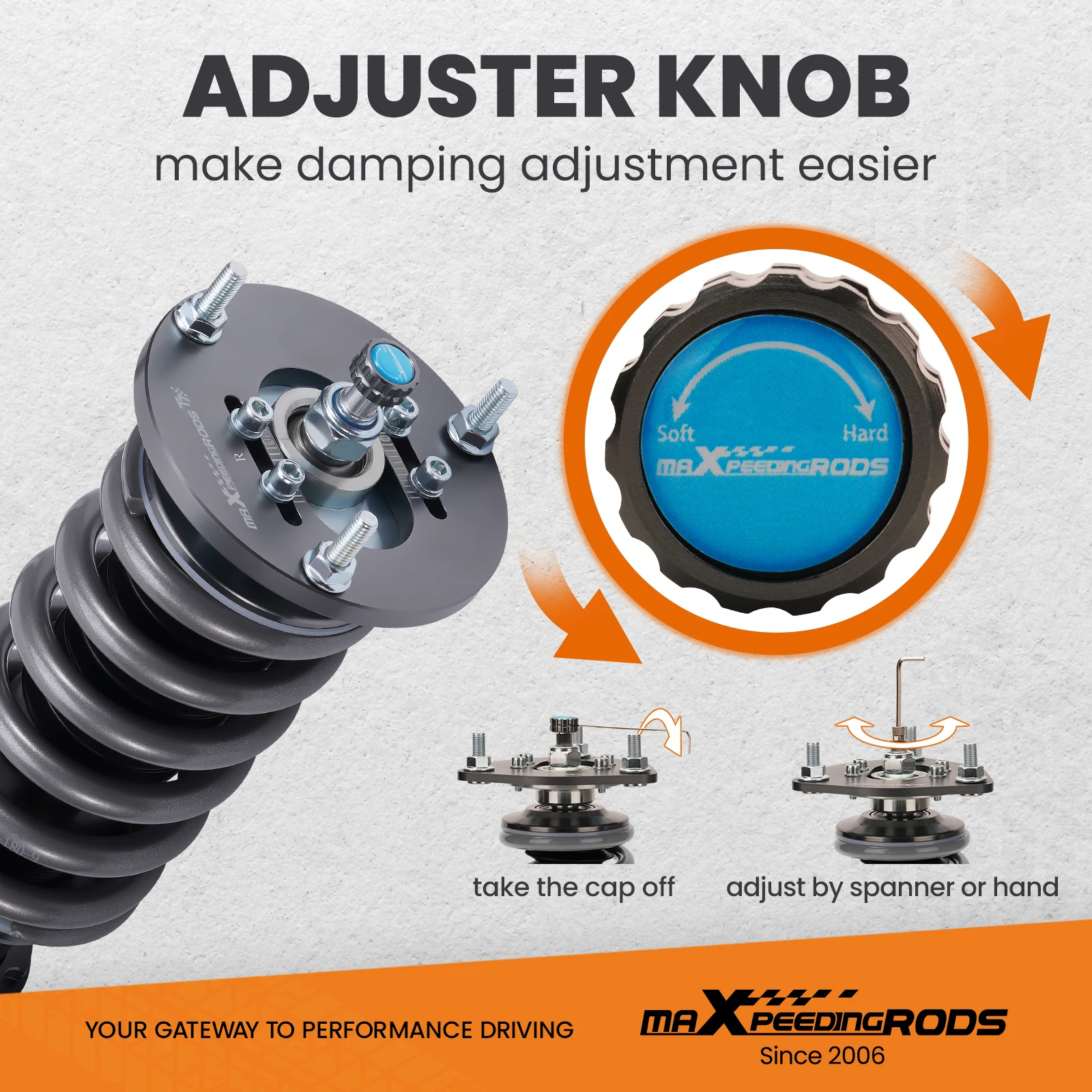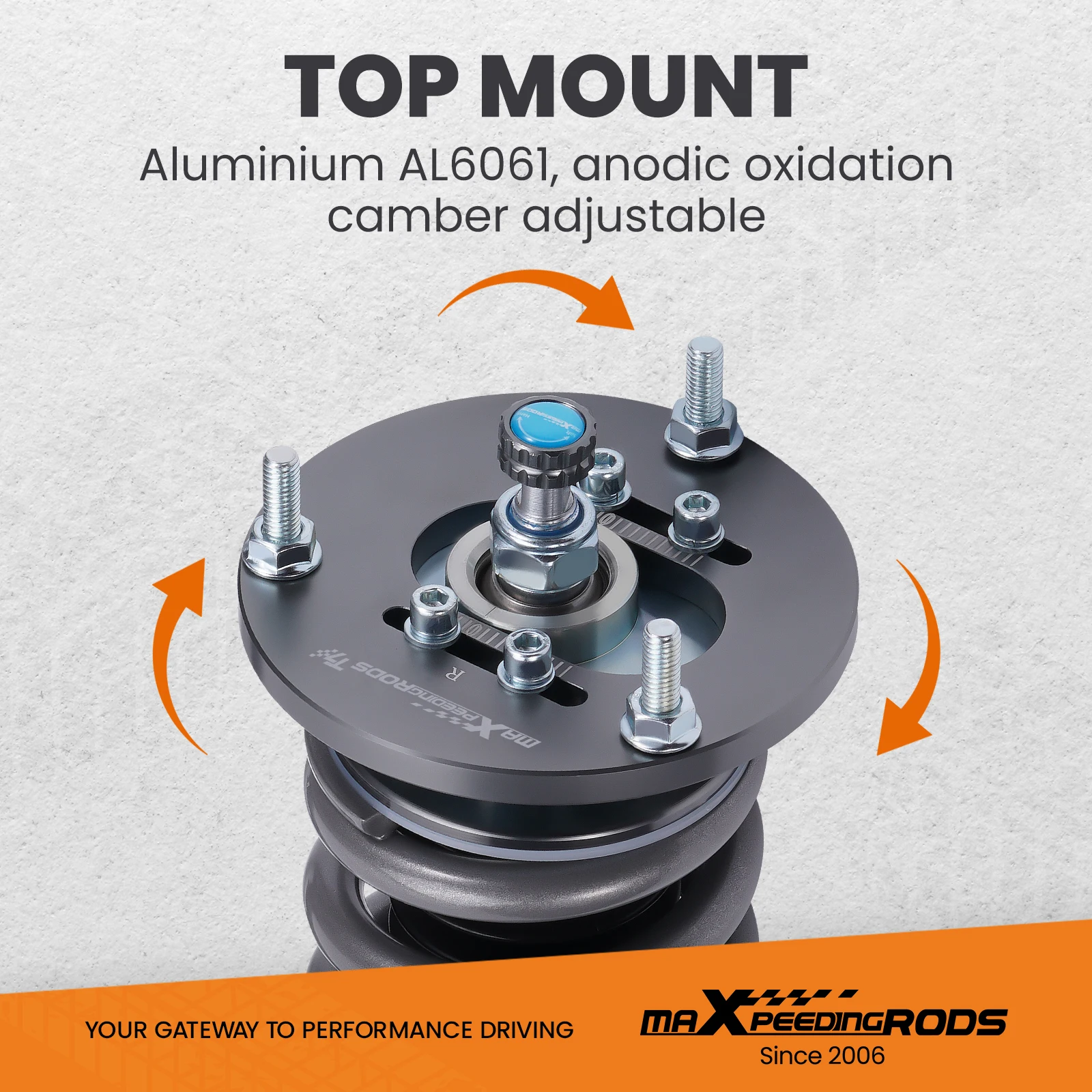 Features 1)Racing damping oil and spring rates set for occassinal track use and daily street use; 2)With better damping setting,you will get better performance and enhanced handling; 3) Lowered height adjustment from 1″ – 3″ (depends on vehicle models)which allow lower center of gravity and also add a more aggressive stance; 4) Adjustable pre-load spring tension to reduce the shaking motion to a certain extent; 5) 24 levels of adjustable damper — This allows you the ability to perfectly dial in your coilovers system.; 6) CNC machined Aluminum top mounts and lockers– – excellent strength, and save weight; 7) Heavy Duty Steel Lower Mounts—Highly Durable & Reliable; 8) All inserts come with fitted long rubber boots— To protect the damper more well and be durable; 9)Twin-Tube structure —provides excellent handling & control characteristics for most driving conditions 10) Corrosion Finish – Anodized Aluminum And Powder Coated Carbon Steel Parts, matt finished surface 11) Test for the best—Every parts were tested on our professional machine before assembled and tested by our professional racers on road. 12) Clean room assembled—maintain higher level of accuracy and reliability. | ||
