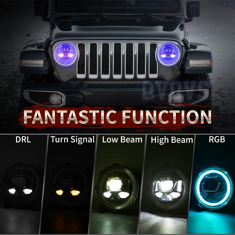 With the dual-beam lens, the high beam and low beam share the same lens, the switch of the high beam and the low beam can be realized through the shading plate inside the lens! Come with unique white DRL, amber turn signal light halo ,RGB halo function. There will be a amber welcome light before you turn on the DRL, high beam and low beam.